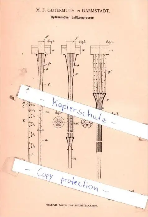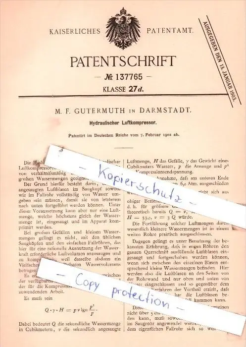 Original Patent - M. F. Gutermuth in Darmstadt , 1902 , Hydraulischer Luftkompressor !!!
