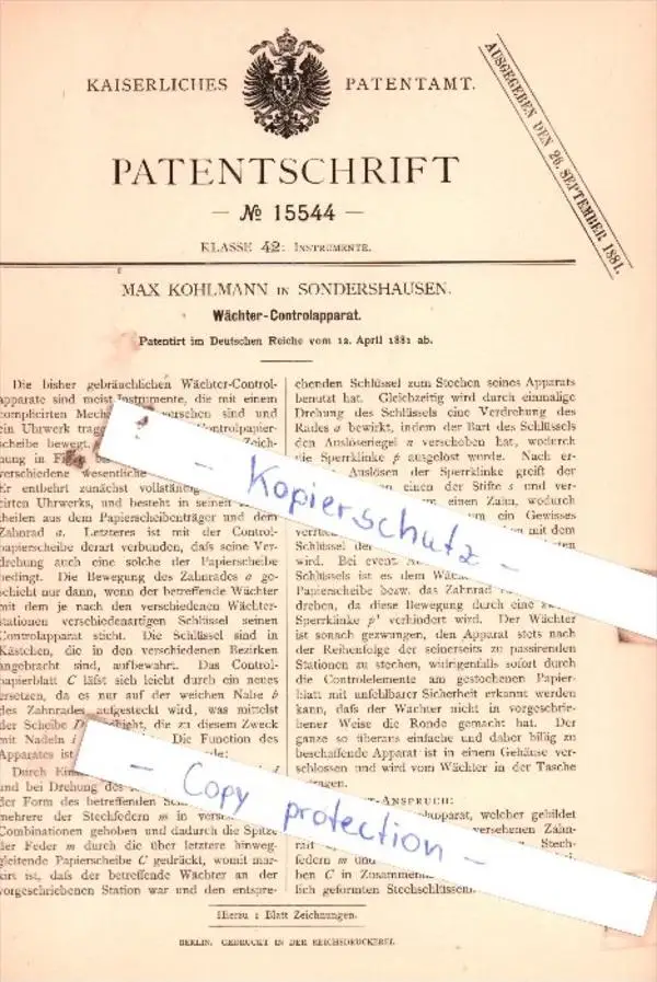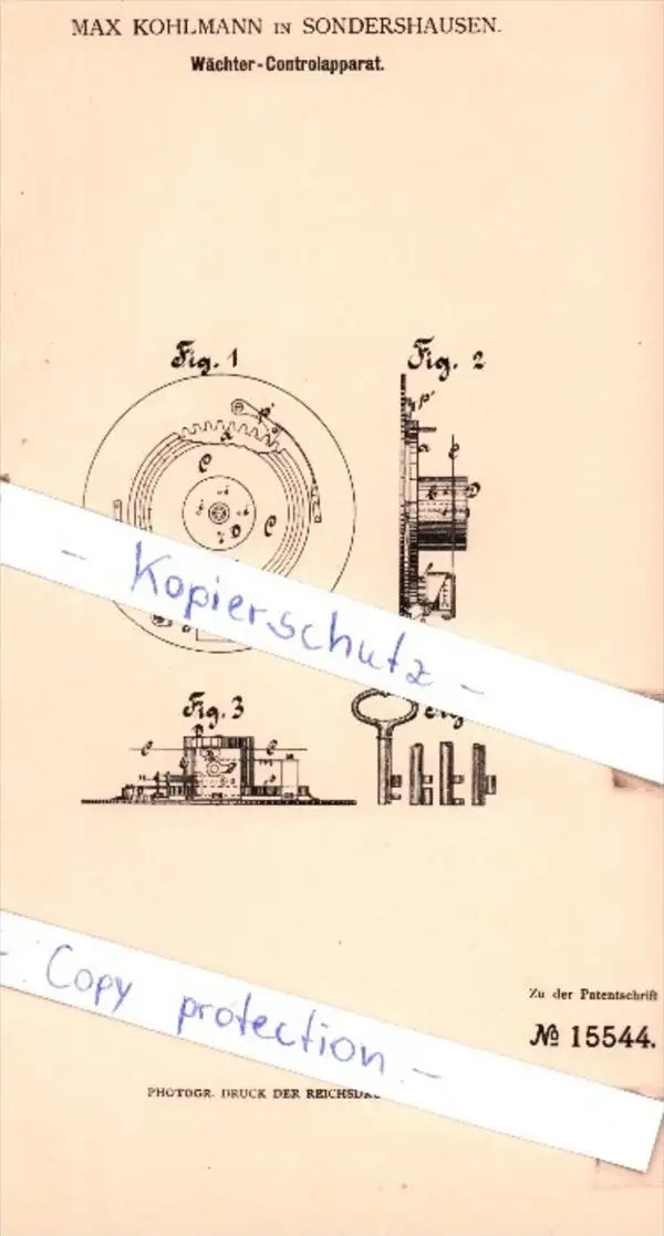 Original Patent - Max Kohlmann in Sondershausen , 1881 , Wächter-Controlapparat !!!