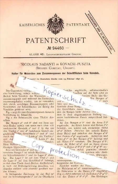 Original Patent - Nicolaus Nadànyi in Kovacsi-Puszta , Biharer Comitat , Ungarn , 1897 , Kovács !!!