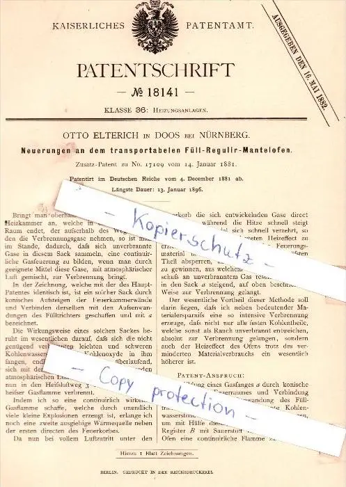 Original Patent - Otto Elterich in Doos bei Nürnberg , 1881 , Füll-Regulir-Mantelofen !!!