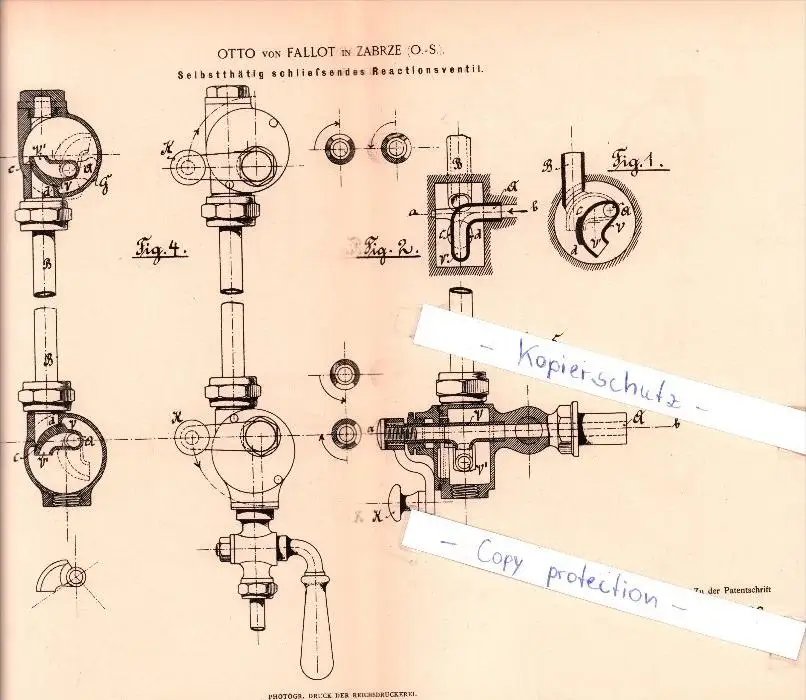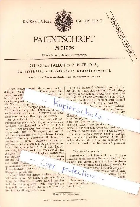 Original Patent - Otto von Fallot in Zabrze , O.-S. , 1884 , Selbstthätig schließendes Reactionventil !!!