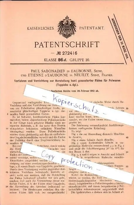 Original Patent - Paul Sabonadier dans Euabonne , 1912 , Production des tapis bariolés , Neuilly !!!