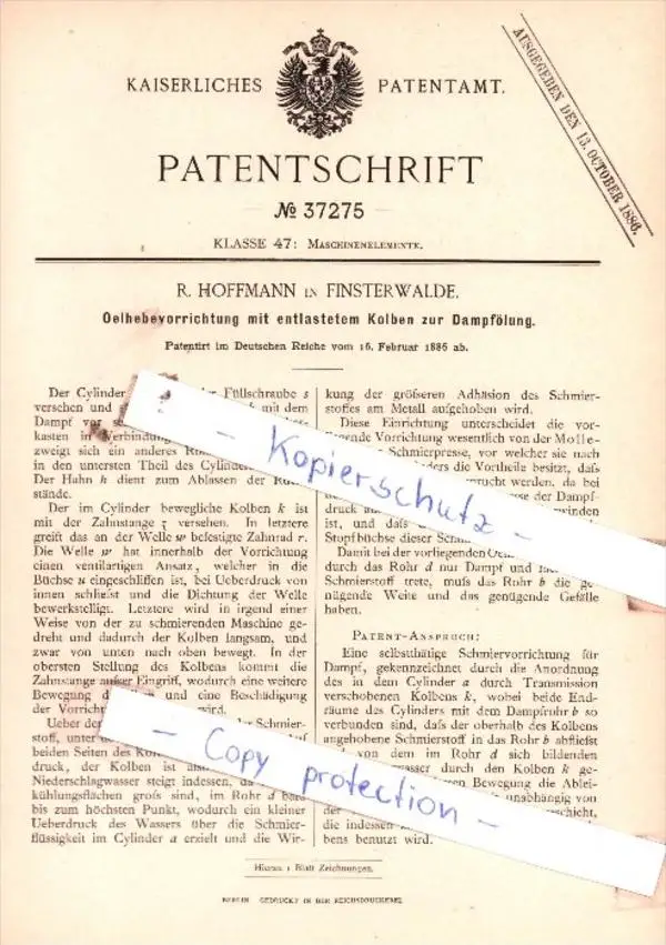 Original Patent - R. Hoffmann in Finsterwalde , 1886 , Maschinenelemente !!!