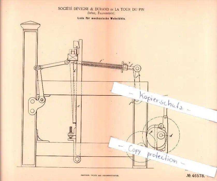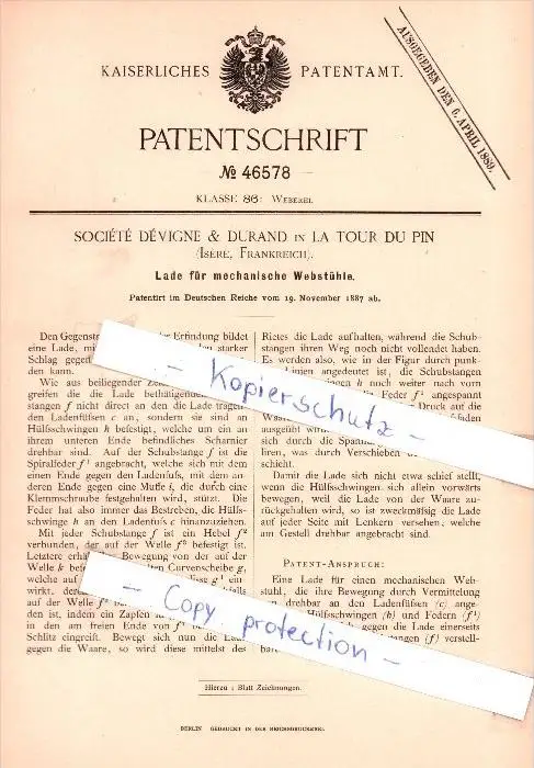 Original Patent - S. Devigne & Durand in La Tour Du Pin , Isere , Frankreich , 1887 , Weberei !!!