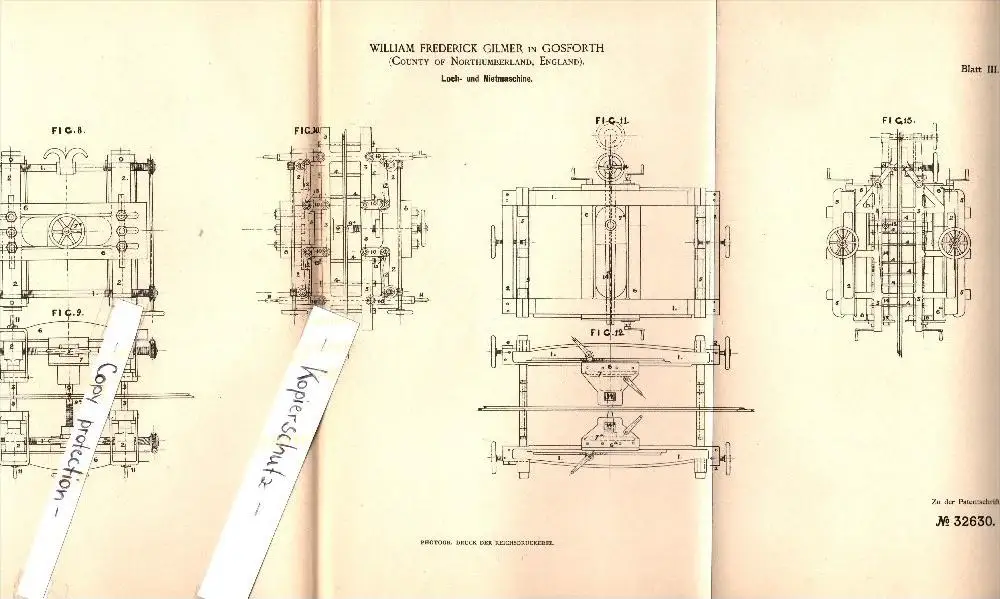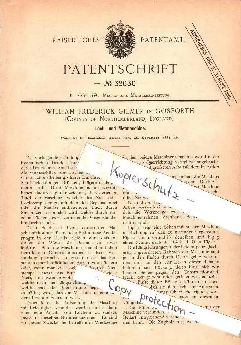Original Patent - W. Gilmer in Gosforth , England , 1884 , Punching and riveting machine !!!