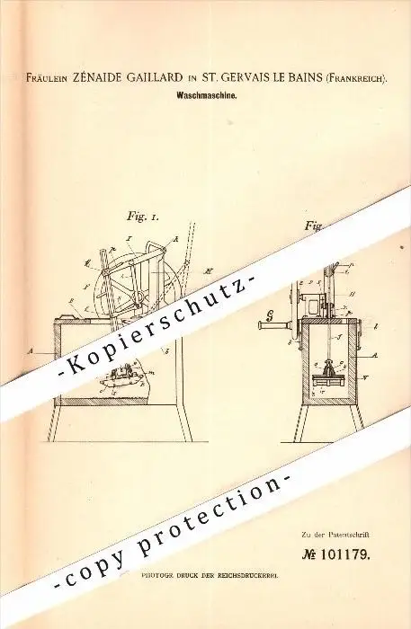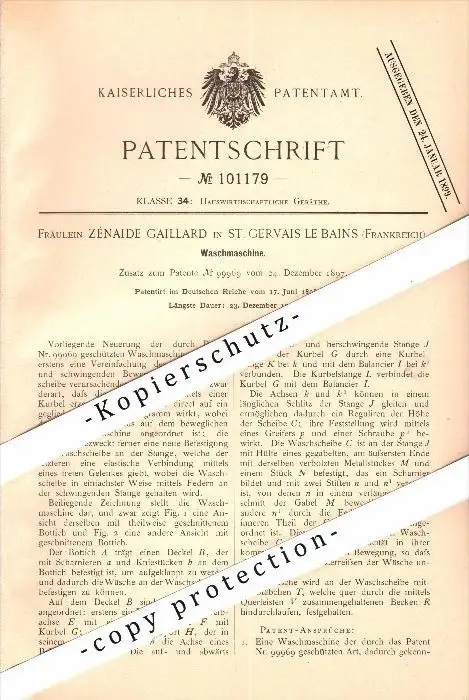 Original Patent - Zénaide Gaillard à Saint-Gervais-les-Bains , 1898 , machine à laver !!!
