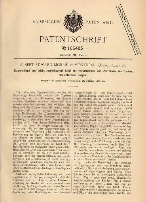 Original Patentschrift - A. Morris in Montreal , 1898 , Cigarrenband , Cigarre , Cigarrenring , Zigarre !!!
