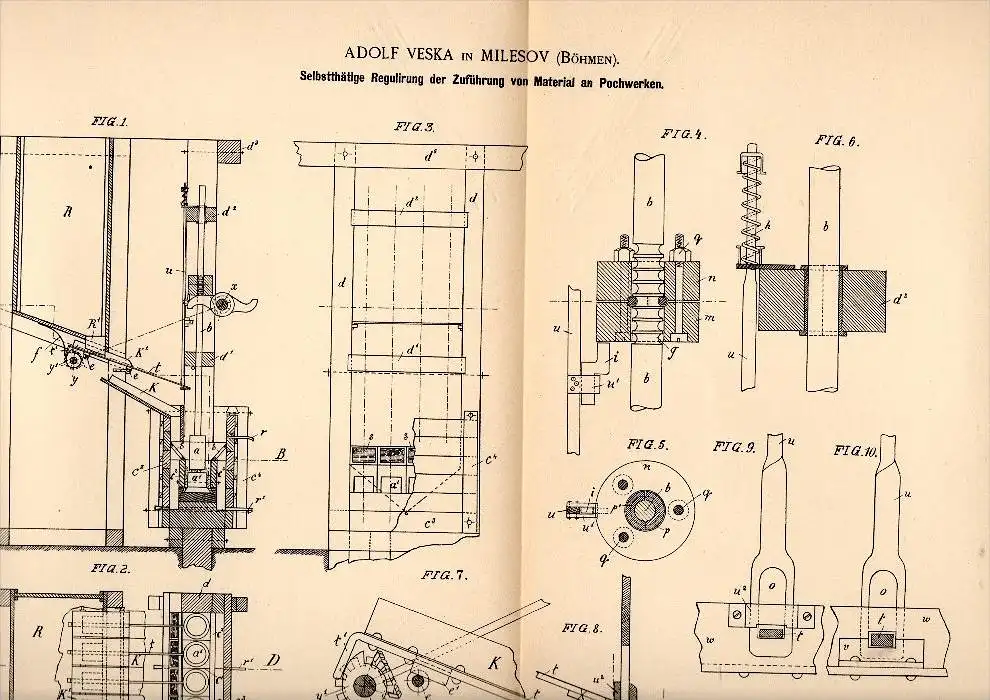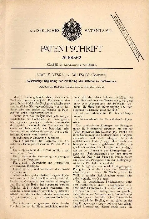 Original Patentschrift - Adolf Veska in Milesov / Milleschau b. Velemin , 1890 , Regulierung an Pochwerk , Erz , Bergbau
