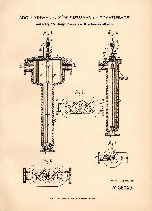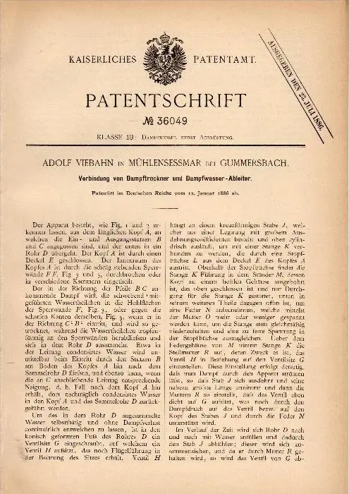 Original Patentschrift - Adolf Viebahn in Mühlensessmar b. Gummersbach , 1886 , Dampftrockner , Dampfmaschine !!!