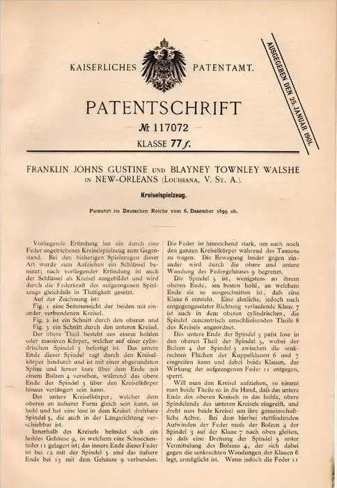 Original Patentschrift -B. Walshe in New Orleans , 1899 , Kreisel , gyroscope, rotary, top, spinning top , Brummkreisel
