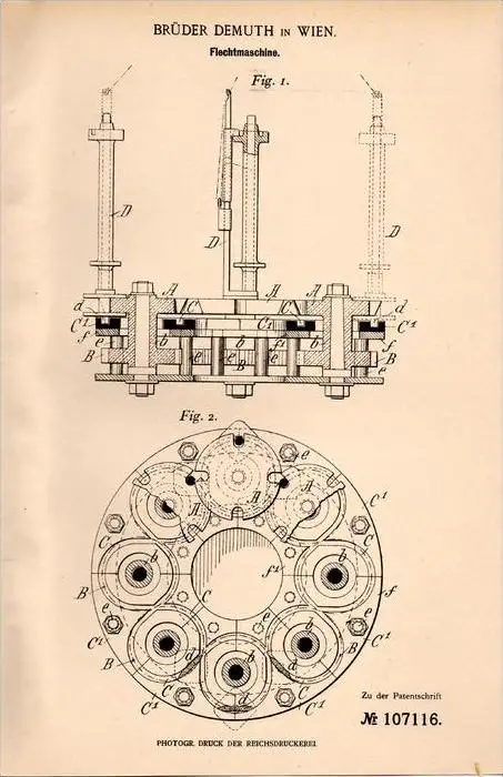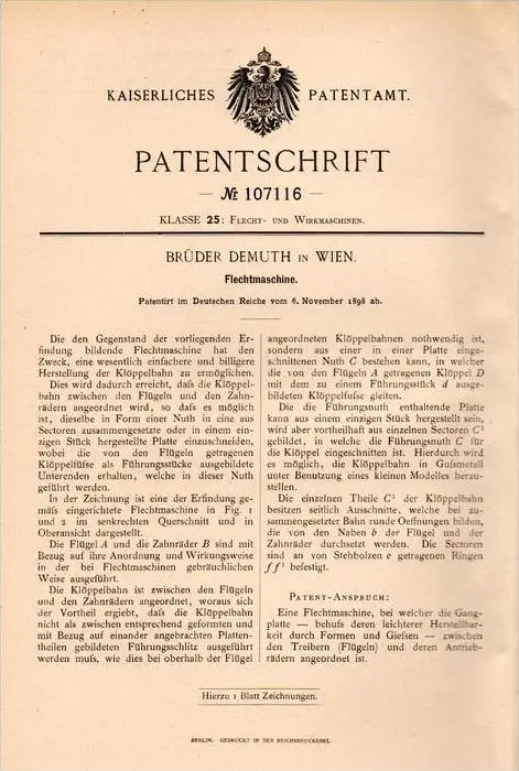 Original Patentschrift - Brüder Demuth in Wien , 1898 , Flechtmaschine , Flechterei , Flechten !!!