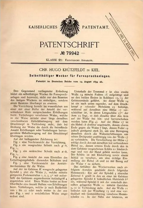 Original Patentschrift - C. Krützfeldt in Kiel , 1894 , Wecker für Fernsprecher , Telephon , Telegraph , Beamte , Amt !!