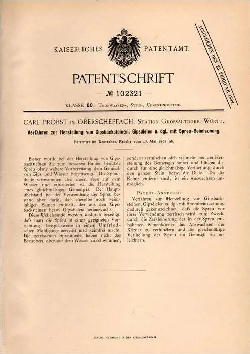 Patent: Herstellung von Gipsbacksteinen und Gipsdielen mit Spreubeimischung