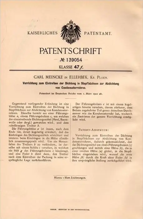 Original Patentschrift - Carl Meincke in Ellerbek , 1902 , Abdichtung für Condensatorrohre , Kondensator , Plön !!!