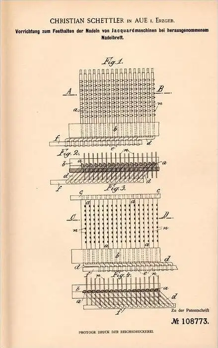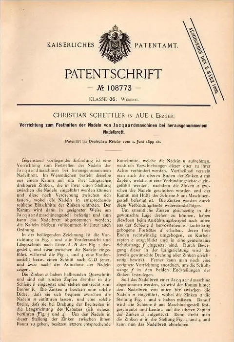 Original Patentschrift - Ch. Schettler in Aue i. Erzgeb., 1899 , Apparat für Jacquardmaschinen , Weberei , Webstuhl !!!