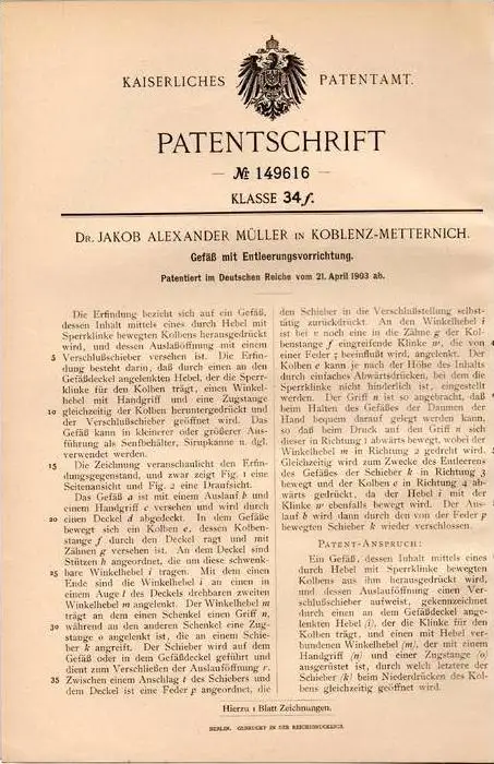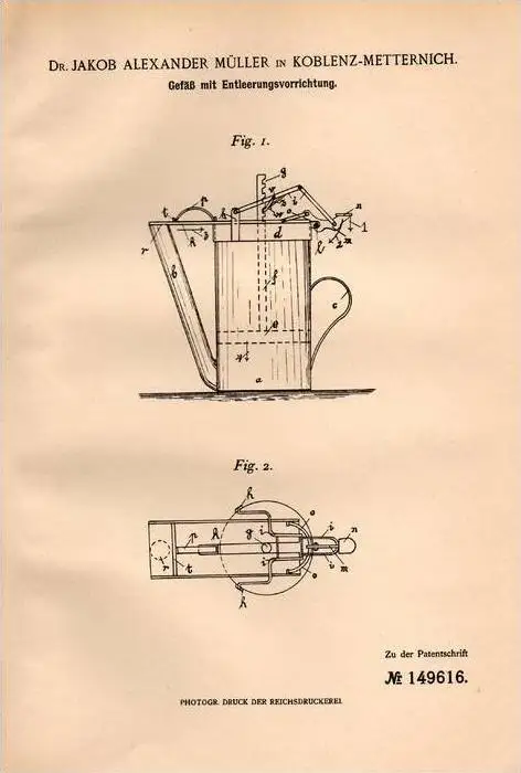 Original Patentschrift - Dr. J. Müller in Koblenz - Metternich , 1903 , Gefäß mit Entleerungsvorrichtung , Kanne !!!