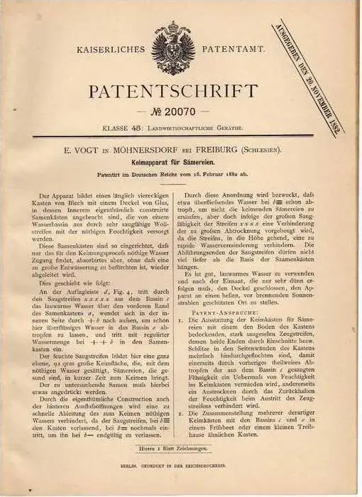 Original Patentschrift - E. Vogt in Möhnersdorf b. Freiburg , 1882 , Keimapparat , Gartenbau !!!