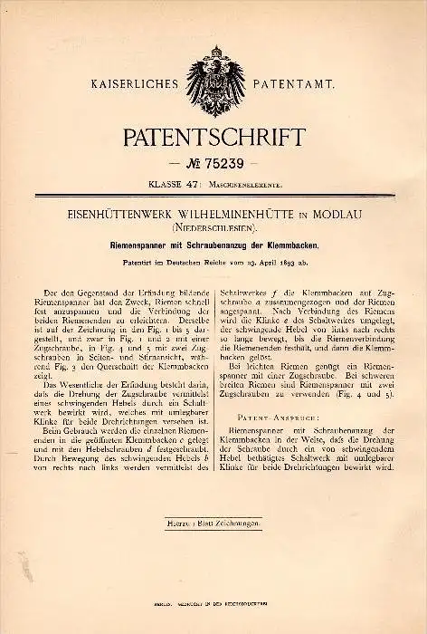 Original Patentschrift - Eisenhüttenwerk Wilhelminenhütte in Modlau / Modla , 1893, Spanner , Gremsdorf / Gromadka