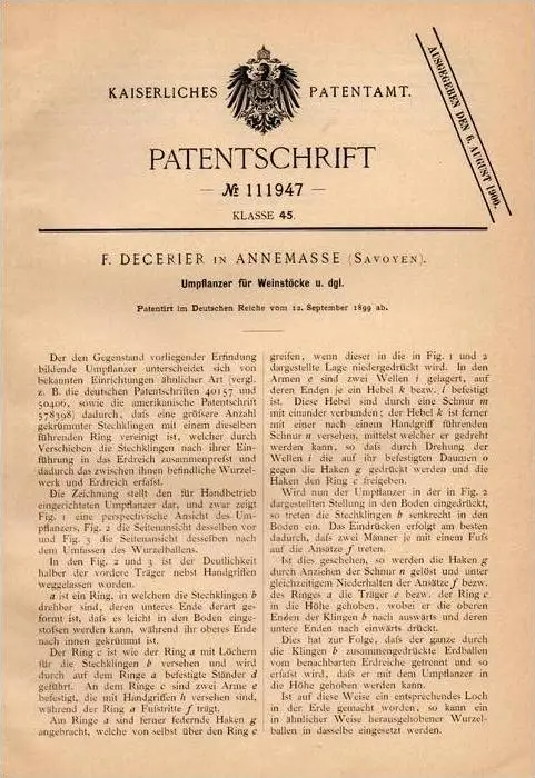 Original Patentschrift - F. Decerier in Annemasse , Haute - Savoie , 1899 , Weinstock - Umpflanzer , Wein !!!