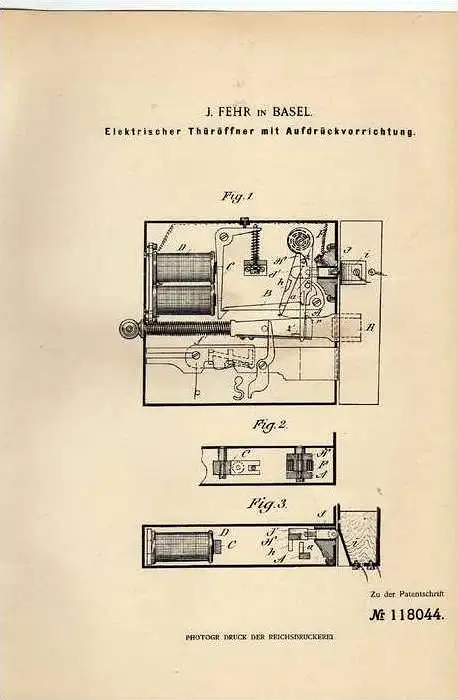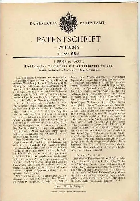 Original Patentschrift - F. Fehr in Basel , elektr. Thüröffner , 1899 !!!