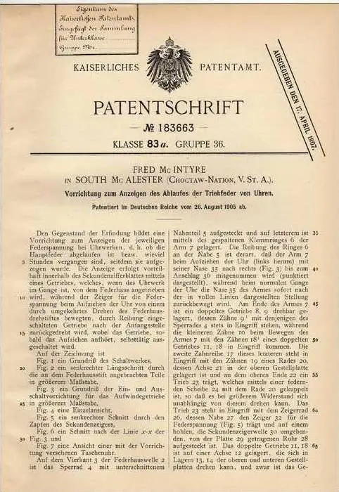 Original Patentschrift - F. Mc Intyre in South Mc Alester , USA , 1905 , Anzeige für Ablauf von Uhren , Uhr , Clock !!!