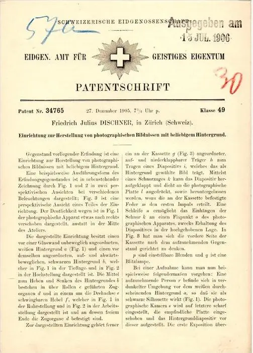 Original Patentschrift - F.J. Dischner in Zürich , 1905 , photographische Bildnisse , Photographie , Fotografie !!!