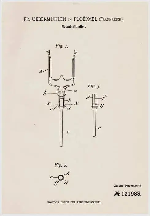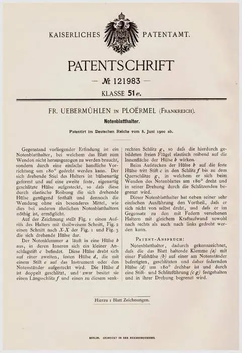 Original Patentschrift - Fr. Uebermühlen in Ploërmel , 1900 , Notenblatt - Halter , Musik , Noten !!!