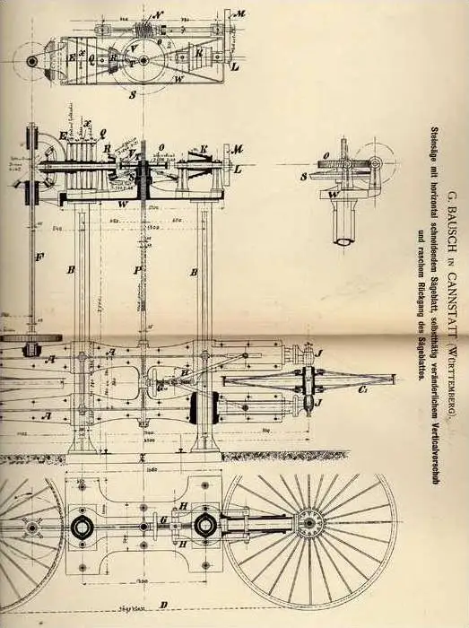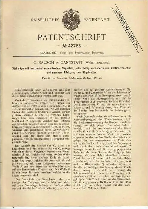 Original Patentschrift - G. Bausch in Cannstatt , 1887 , Steinsäge !!!