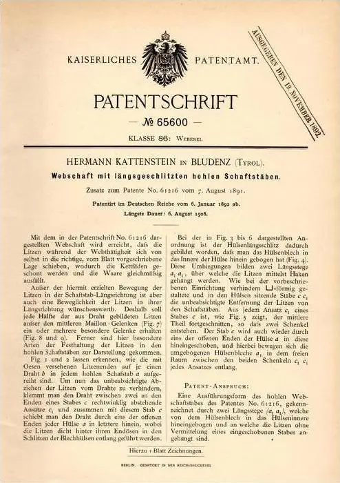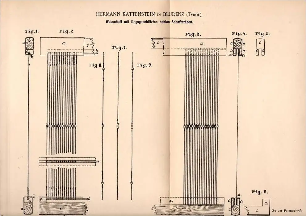 Original Patentschrift - H. Kattenstein in Bludenz , Tirol , 1892, Webschaft für Weberei , Weber , Webstuhl , Vorarlberg