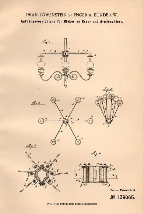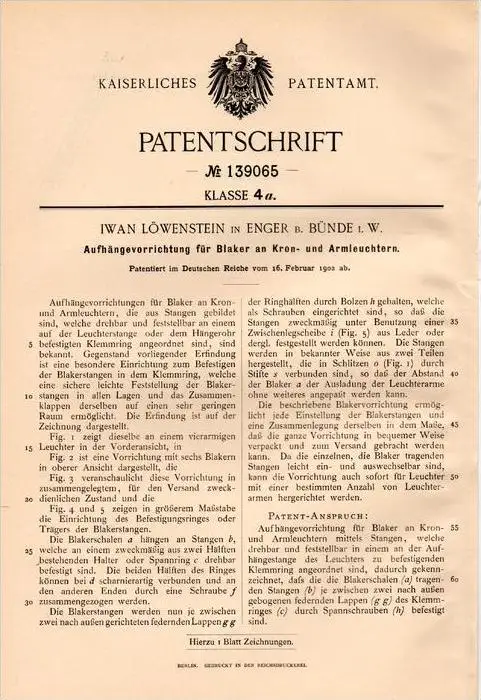 Original Patentschrift - I. Löwenstein in Enger b. Bünde i.W., 1902 , Kronleuchter - Aufhängung , Lampe , Leuchter !!!