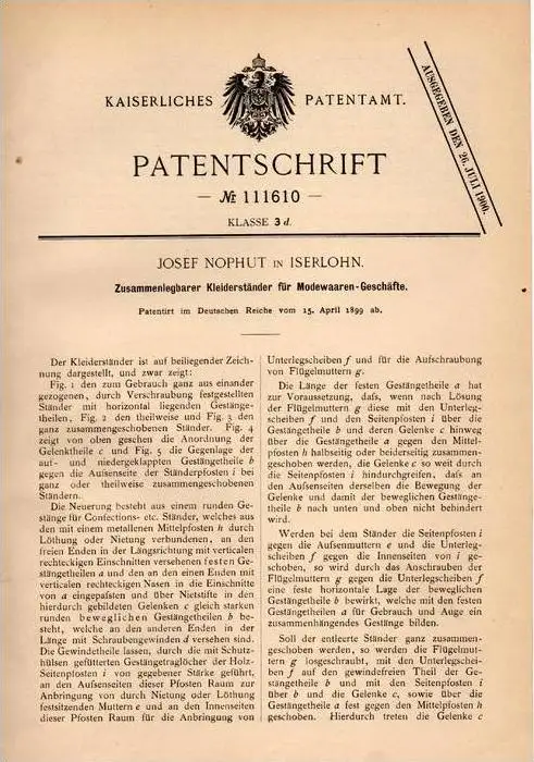 Original Patentschrift - Josef Nophut in Iserlohn , 1899 , Kleiderständer für Mode - Geschäfte , Kleider , Textilien !!!