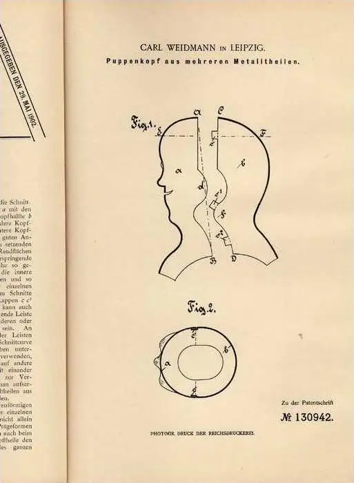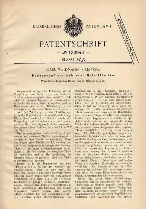 Original Patentschrift - Kopf für Puppe aus Metallteilen , 1900 , C. Weidmann in Leipzig !!!
