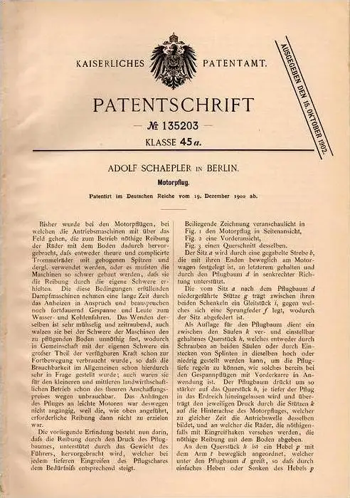 Original Patentschrift - Motorpflug , Traktor , Schlepper , 1900 , Adolf Schaeoler in Berlin !!!