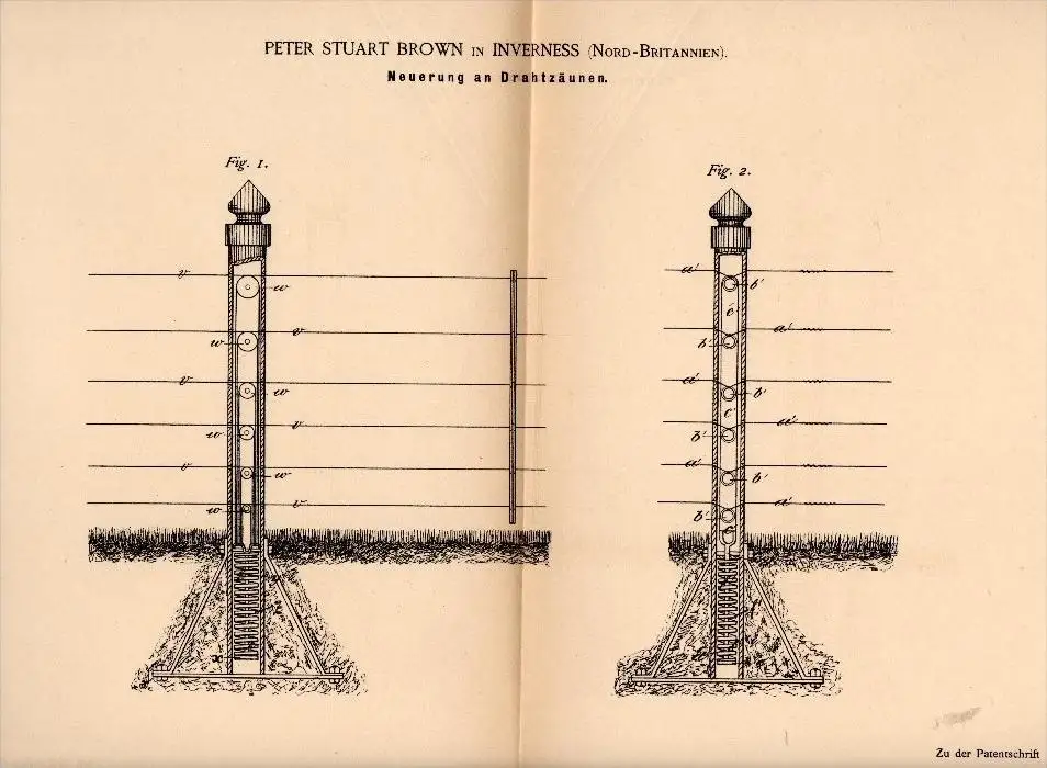 Original Patentschrift - Peter Stuart Brown in Inverness , 1885 , Wire fence, agriculture !!!