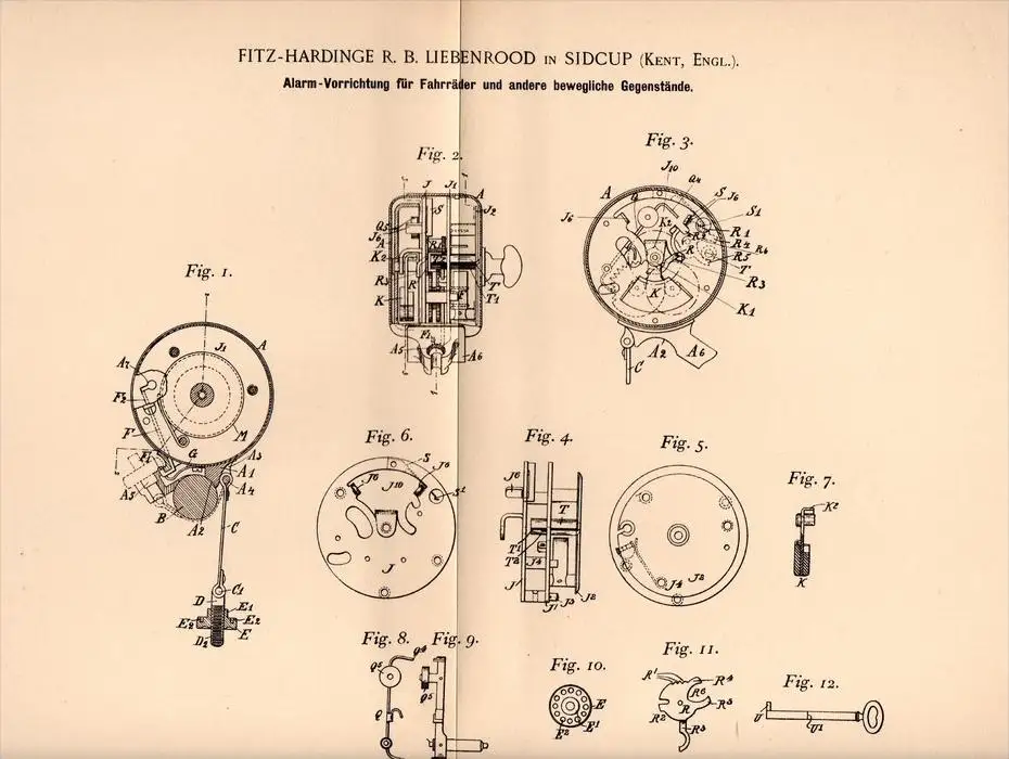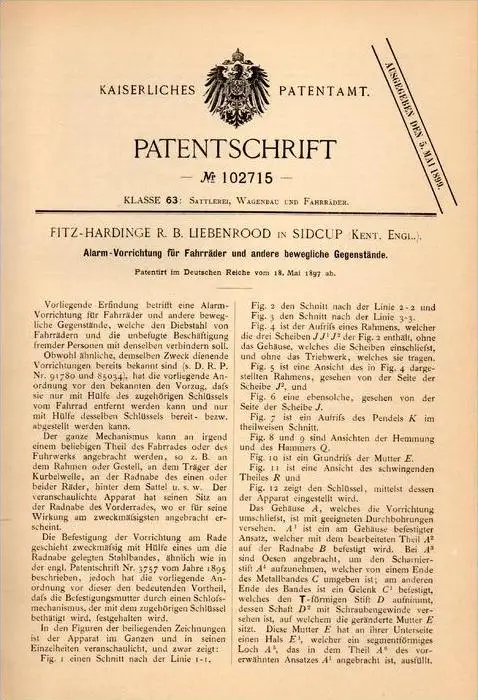 Original Patentschrift - R. Liebenrood in Sidcup , Kent , 1897, for bicycle theft alarm , Alarmanlage !!!