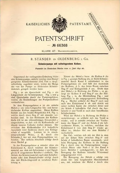 Original Patentschrift - R. Ständer in Oldenburg i.Gr., 1892 , Schmierpumpe mit Kolben , Maschinenbau , Pumpe !!!