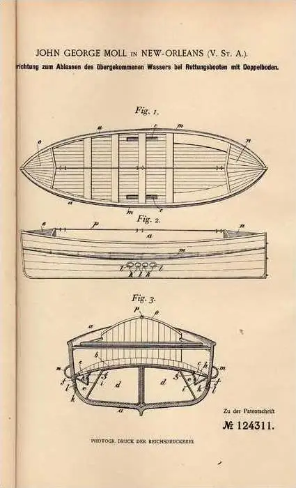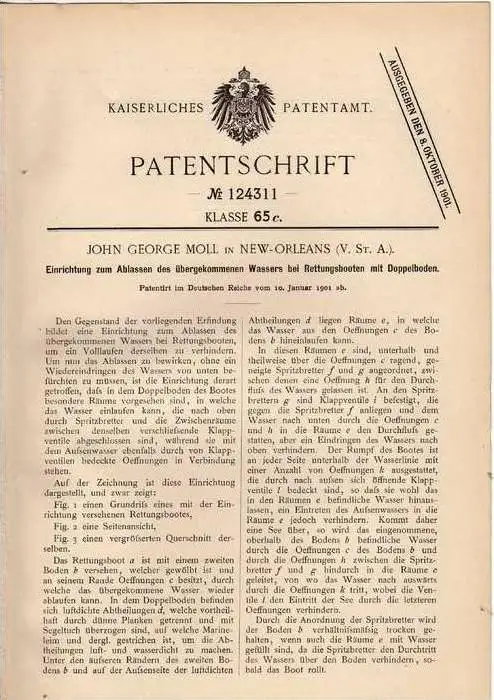 Original Patentschrift - Rettungsboot , 1901 , J. Moll in New Orleans , Titanic , Boot !!!