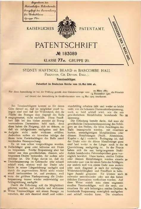 Original Patentschrift - S.H. Beard in Barcombe Hall , Gr. Devon , 1906 , Tennis , Tennisschläger !!!