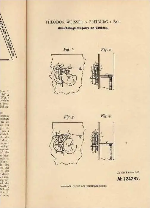 Original Patentschrift - T. Weisser in Freiburg i. Baden , 1900 , Schlagwerk mit Zählhebel , Uhr !!!