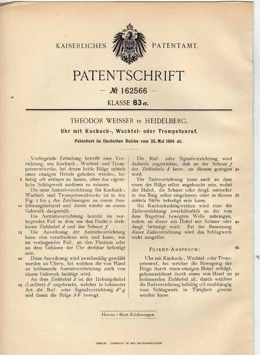 Original Patentschrift - Th. Weisser in Heidelberg , 1904 , Uhr mit Kuckuck -, Wachtel - oder Trompetenruf , Kuckucksuhr