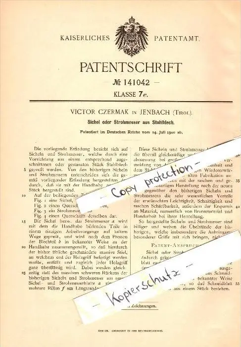 Original Patentschrift - V. Czermak in Jenbach , Tirol , 1900 , Sichel oder Strohmesser aus Stahlblech !!!