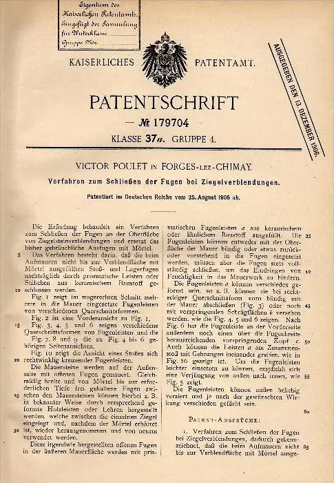 Original Patentschrift - Victor Poulet in Forges lez Chimay , 1905 , Ziegel - Verbrennung , Ziegelei !!!