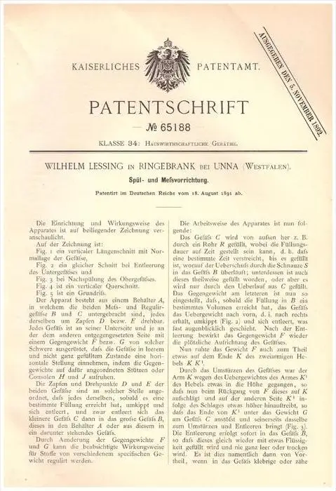 Original Patentschrift - Wilhelm Lessing in Ringebrank b. Unna , 1891 , Spül- und Meßvorrichtung , Apparat !!!