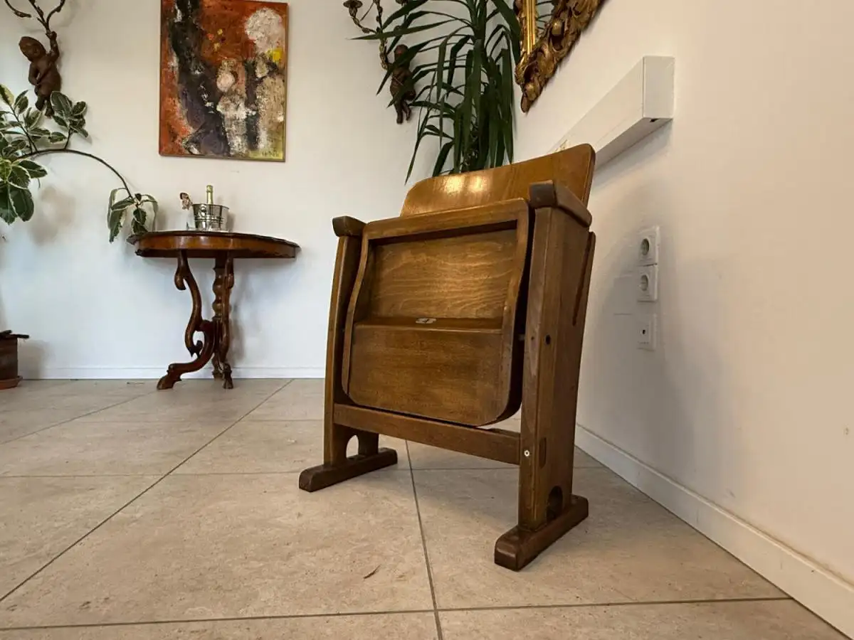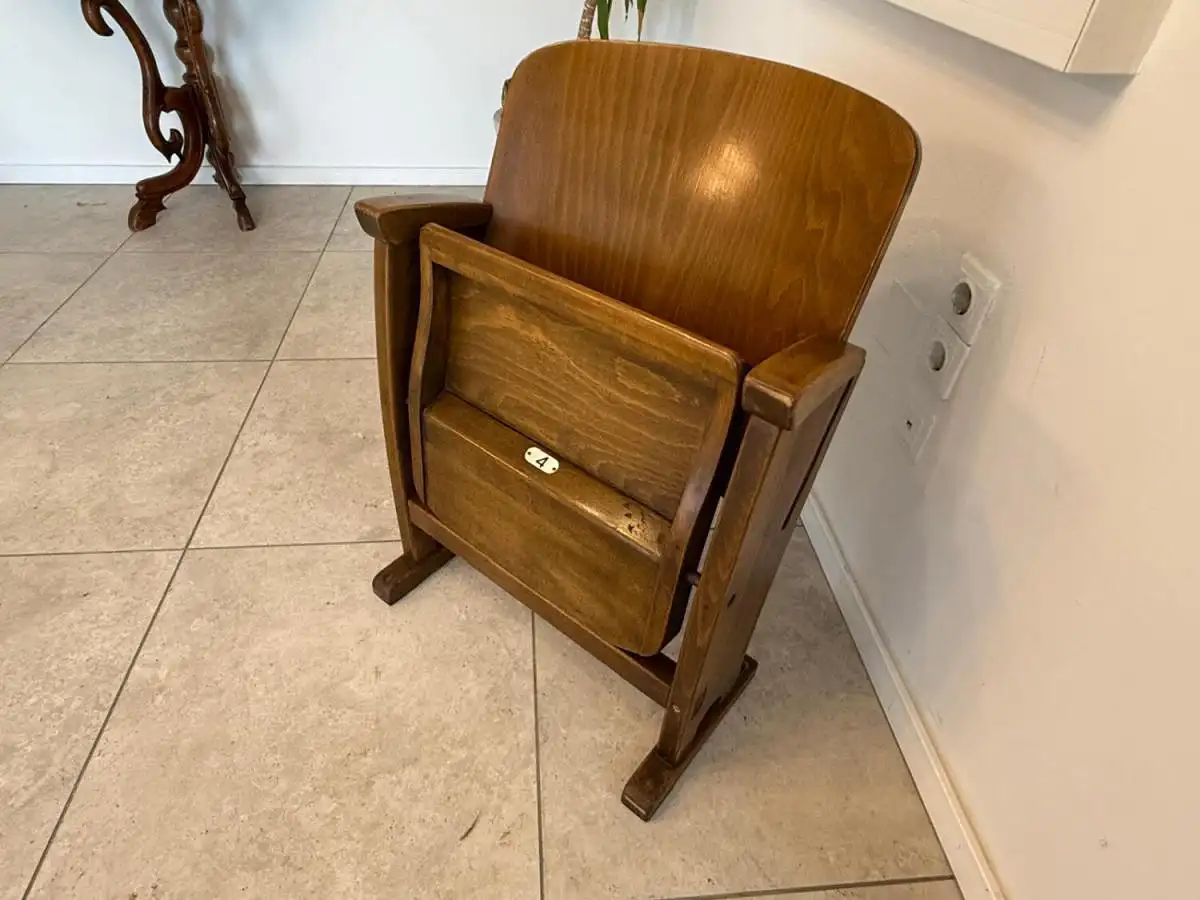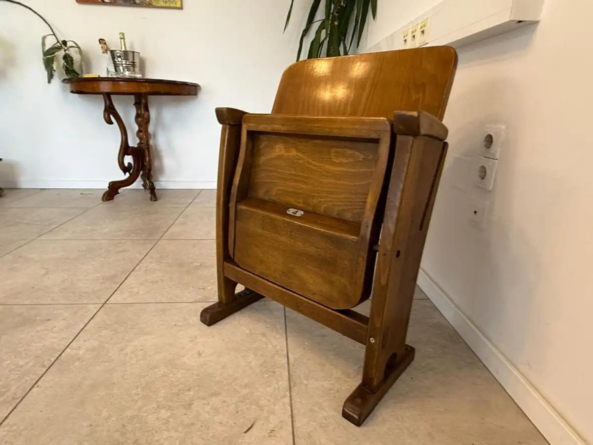 Dieses seltene Sitzmöbel stammt aus einem historischen Lichtspielhaus in Wien und überzeugt durch seine geschwungene Linienführung, die robuste Holzkonstruktion und die klappbare Sitzfläche mit Metallmechanik. Besonders charmant ist die nummerierte Plakette („4“) auf der Vorderseite – ein Detail, das Sammler und Designfans gleichermaßen begeistert.