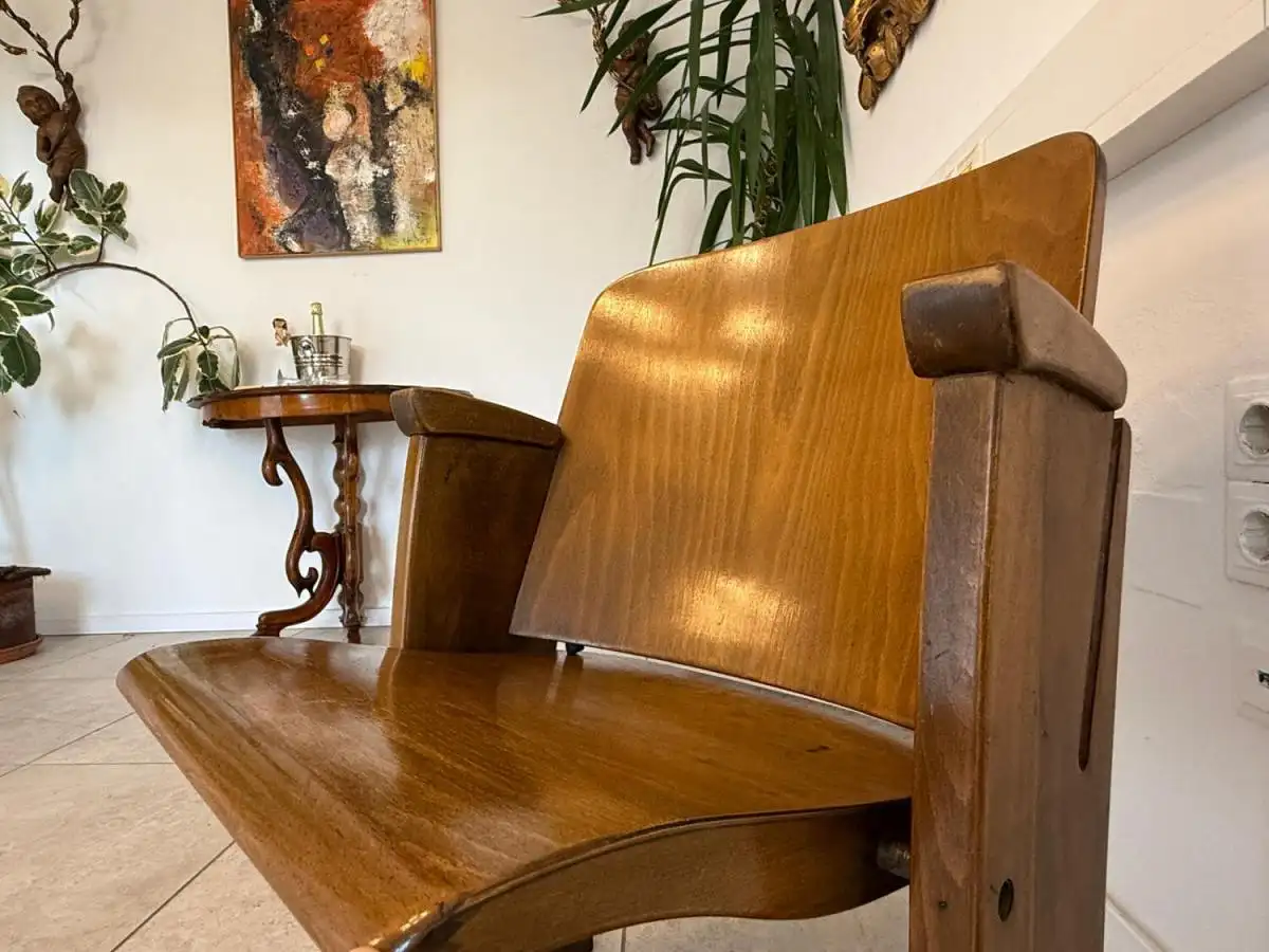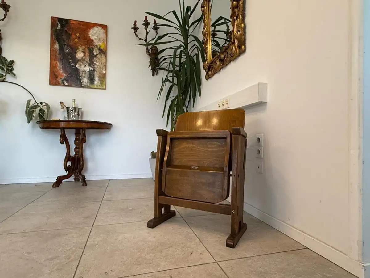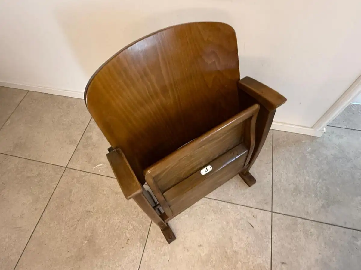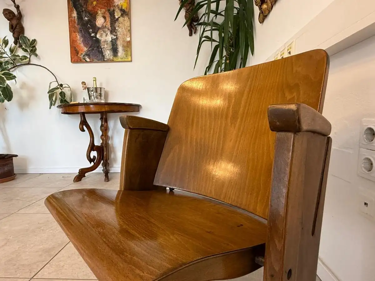 Dieses seltene Sitzmöbel stammt aus einem historischen Lichtspielhaus in Wien und überzeugt durch seine geschwungene Linienführung, die robuste Holzkonstruktion und die klappbare Sitzfläche mit Metallmechanik. Besonders charmant ist die nummerierte Plakette („4“) auf der Vorderseite – ein Detail, das Sammler und Designfans gleichermaßen begeistert.