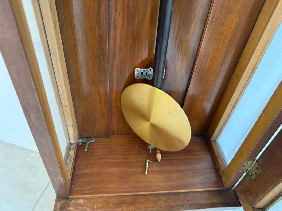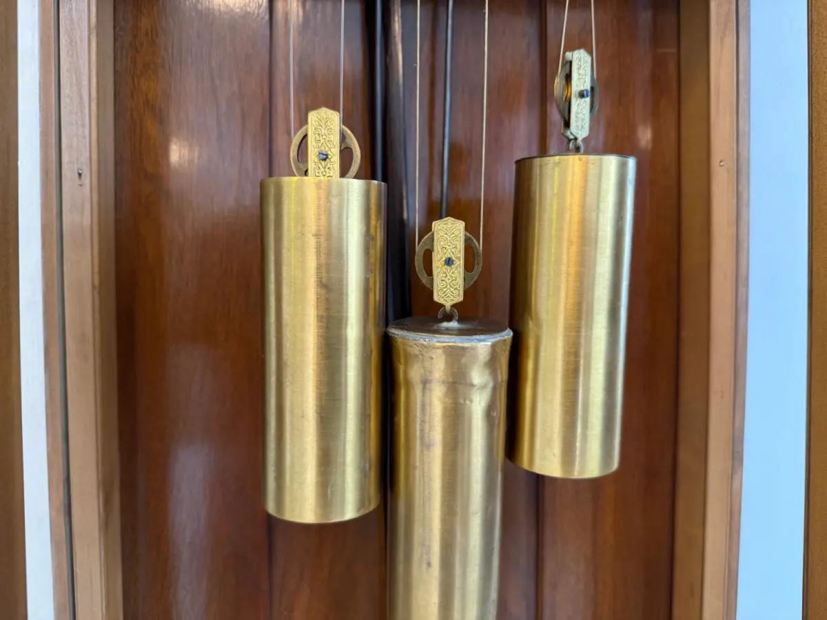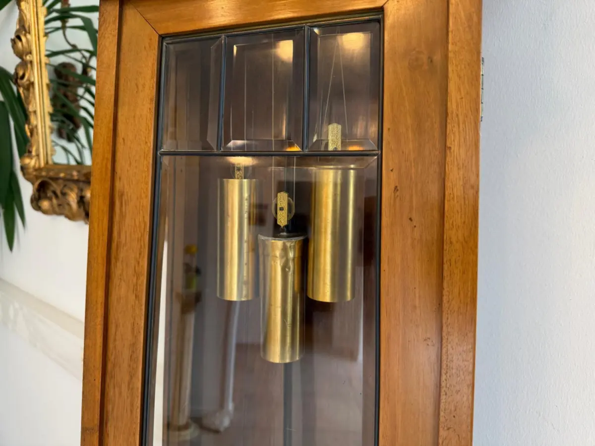 Die Uhr besitzt drei schwere Messinggewichte und ein Pendel mit Sichtfenster im Gehäuse – typisch für hochwertige Zeitmesser der Epoche.