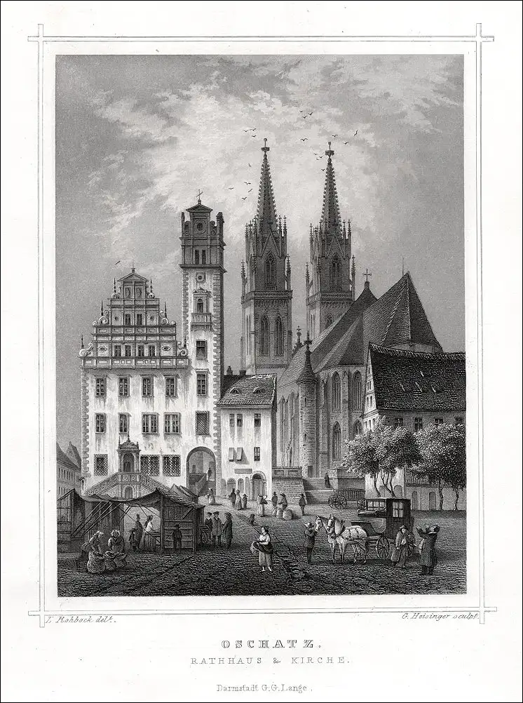 Oschatz. Rathaus & Kirche Original Stahlstich Heisinger um 1860