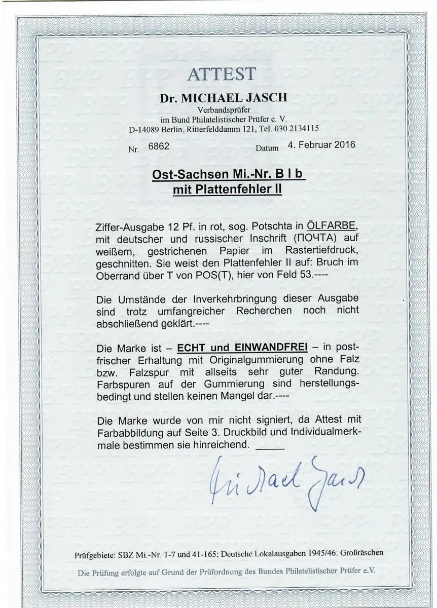 Ost-Sachsen MiNr. B I b, Plattenfehler II, postfrisch, **, BPP Attest