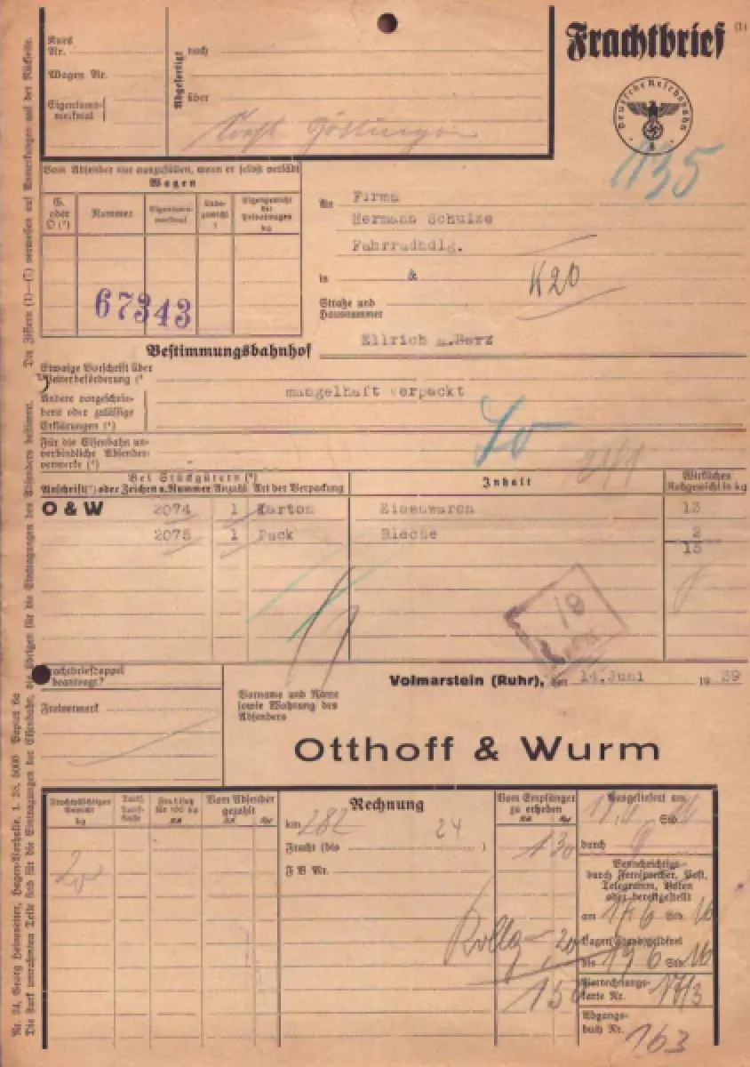 Otthoff & Wurm GmbH Volmarstein / Ruhr Frachtbrief 1939