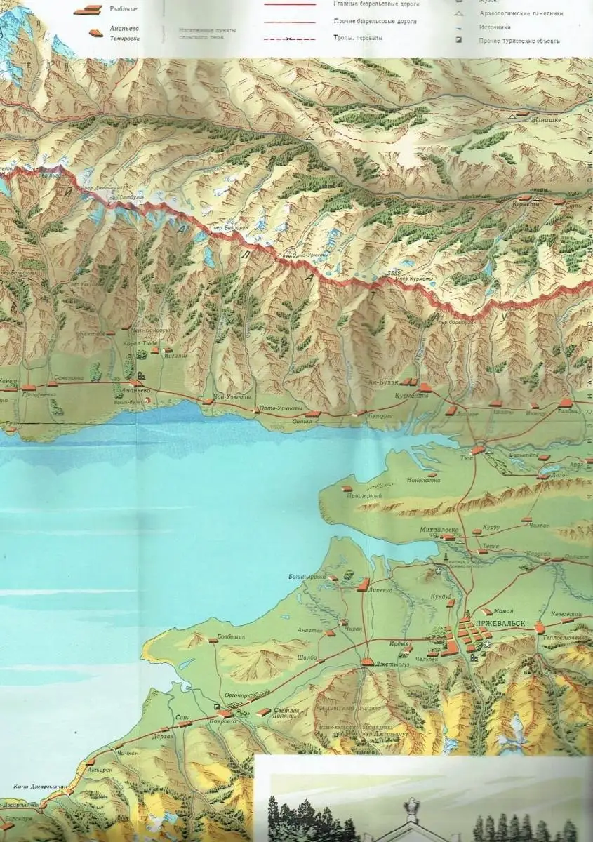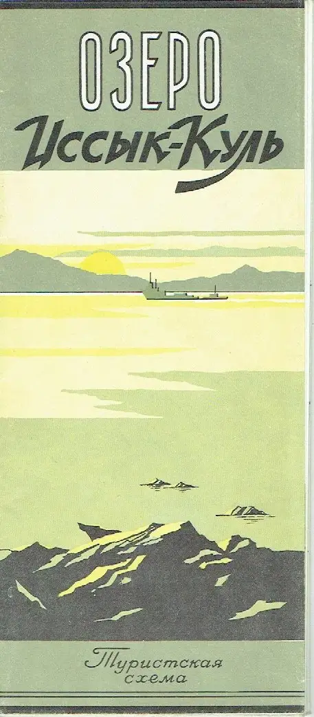 sehr guter Zustand, geringe Gebrauchs- und Alterungsspuren, Reliefkarte des Yssykköl (Issyk-Kul) in Kirgisistan (Zentralasien) mit vielen Informationen, Papier, ca. 11,5 x 26,5 (aufgeklappt ca. 69 x 53), 24 Seiten mit 11 Bildern